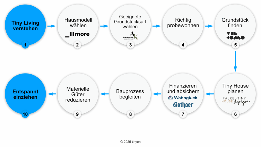 „Vom kleinen Wohntraum zum fertigen Zuhause“ – der Ratgeber für deinen Weg ins Tiny House. Wir begleiten dich damit durch den gesamten Prozess – von der Wahl des richtigen Modells, der Grundstückssuche über die Baugenehmigung bis zum Einzug. Zahlreiche konkrete To-do- und Checklisten machen es zu einem vollumfänglichen Kompass.